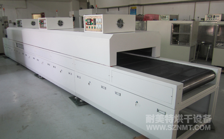 烘干爐部分外形尺寸:長8米,外寬1.17米,網帶寬0.85米,總高1.27米,出料部分長1.0米,烘干部分長6米,進料部分長1.0米;