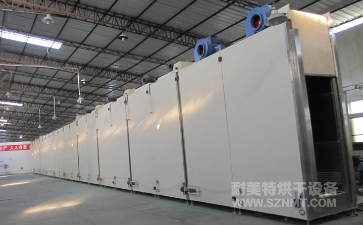 箱體內膽尺寸:寬0.9米*高2.9米*長40米; 箱體共分為10段,每段長度=4米,其中預熱2段,烘干4段,程序降溫3段,強制冷卻1段;